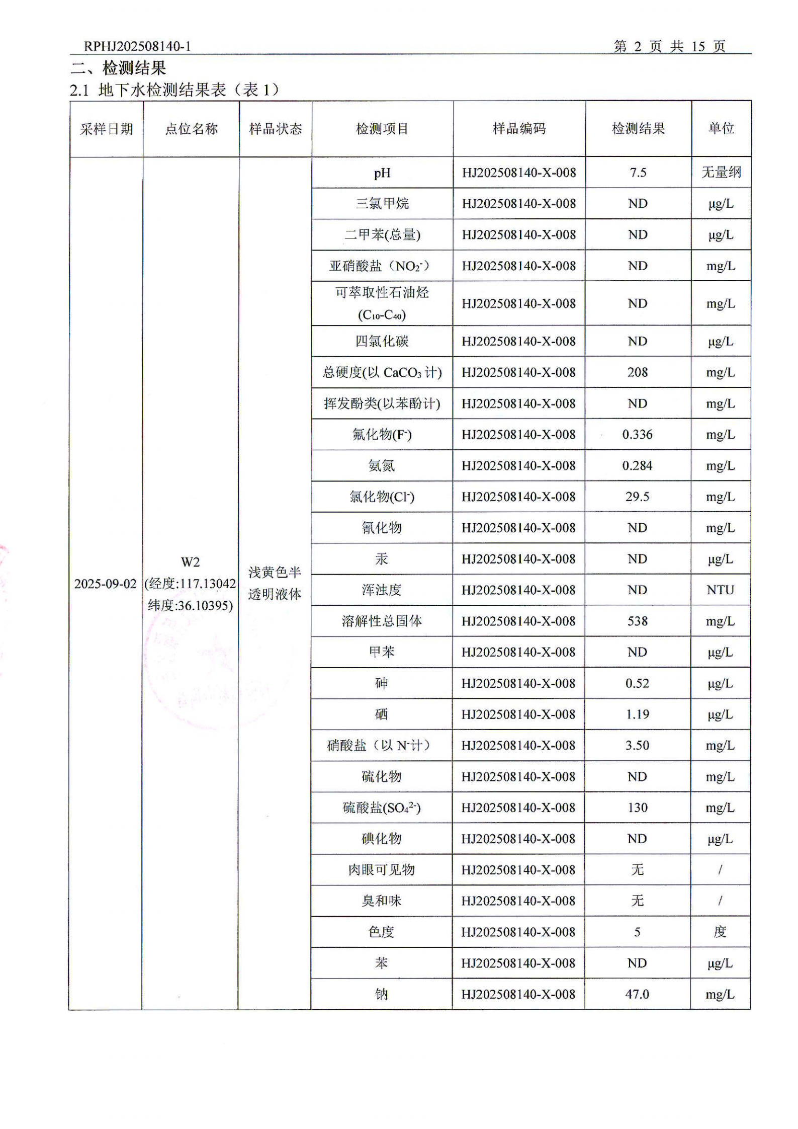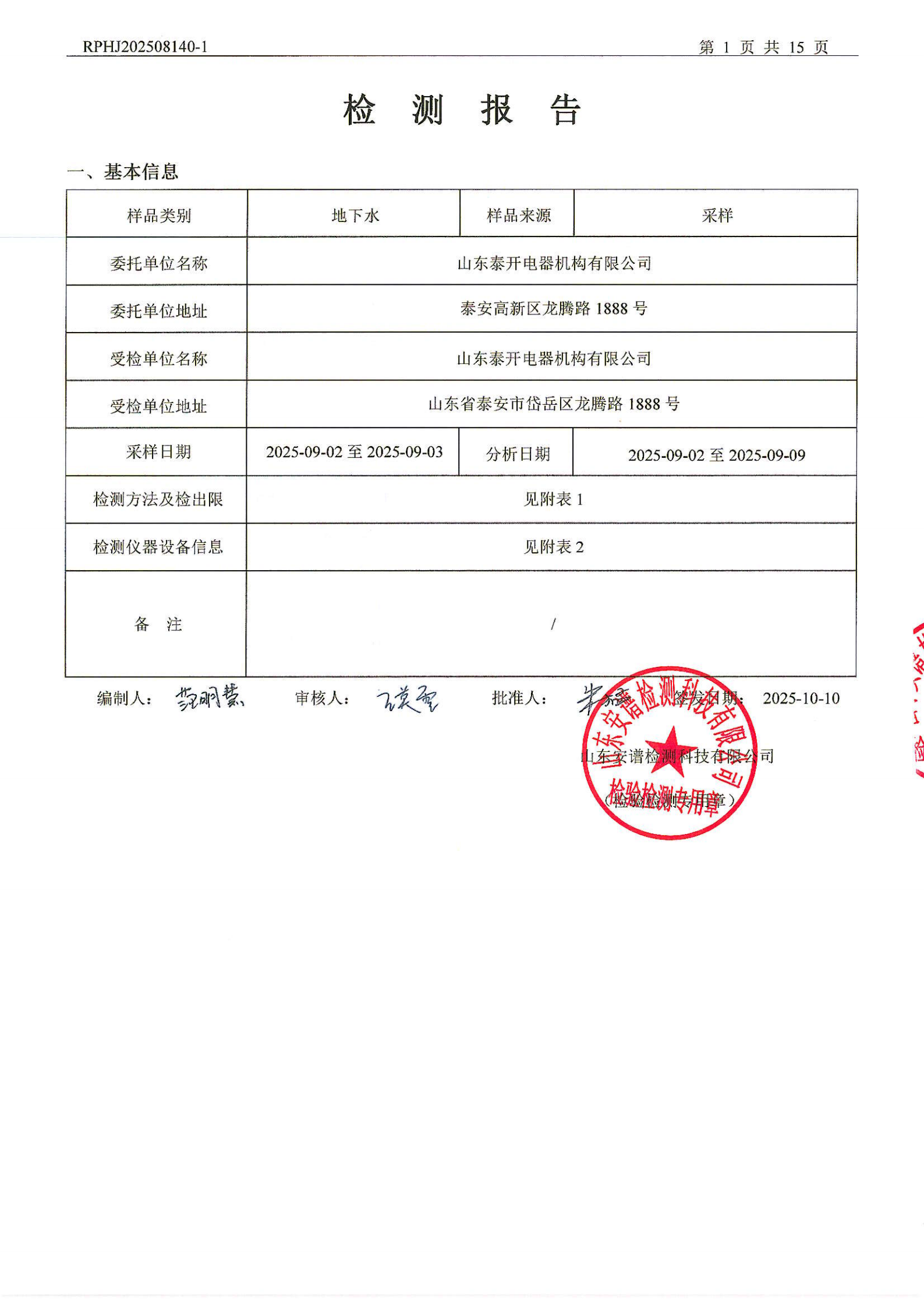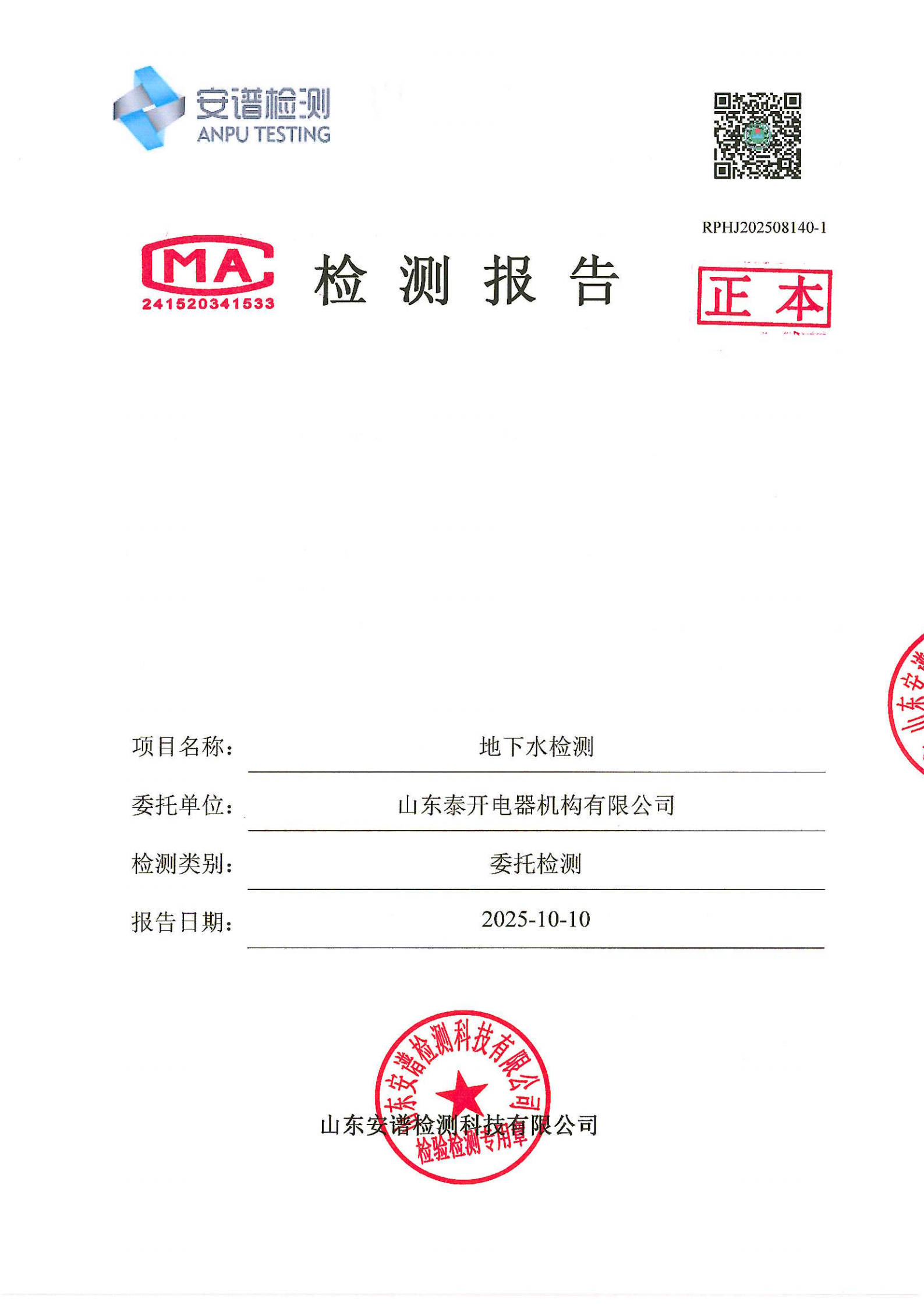 山东泰开电器机构有限公司地下水检测